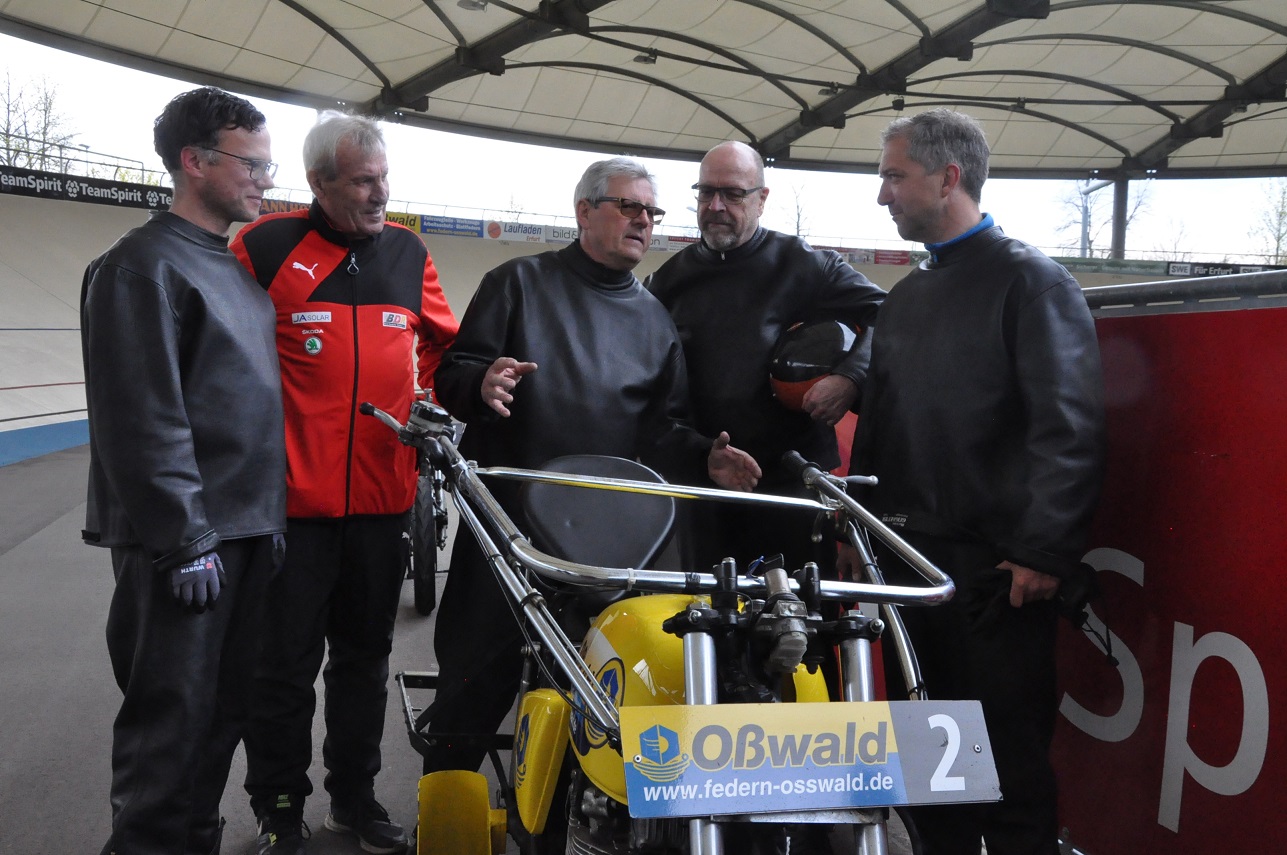 Es war eine gute Entscheidung des Bundes Deutscher Radfahrer (BDR) den Lehrgang in Erfurt mit den perfekt laufenden Schrittmachermaschinen durchzuführen. Dann ging es an zwei Tagen auch mit Theorie und Praxis unter Leitung des Ex-Schrittmacher Europameisters Gerd Geßler (Erfurt) und Ex-Steher Weltmeisters Rainer Podlesch (Berlin) schnell zur Sache