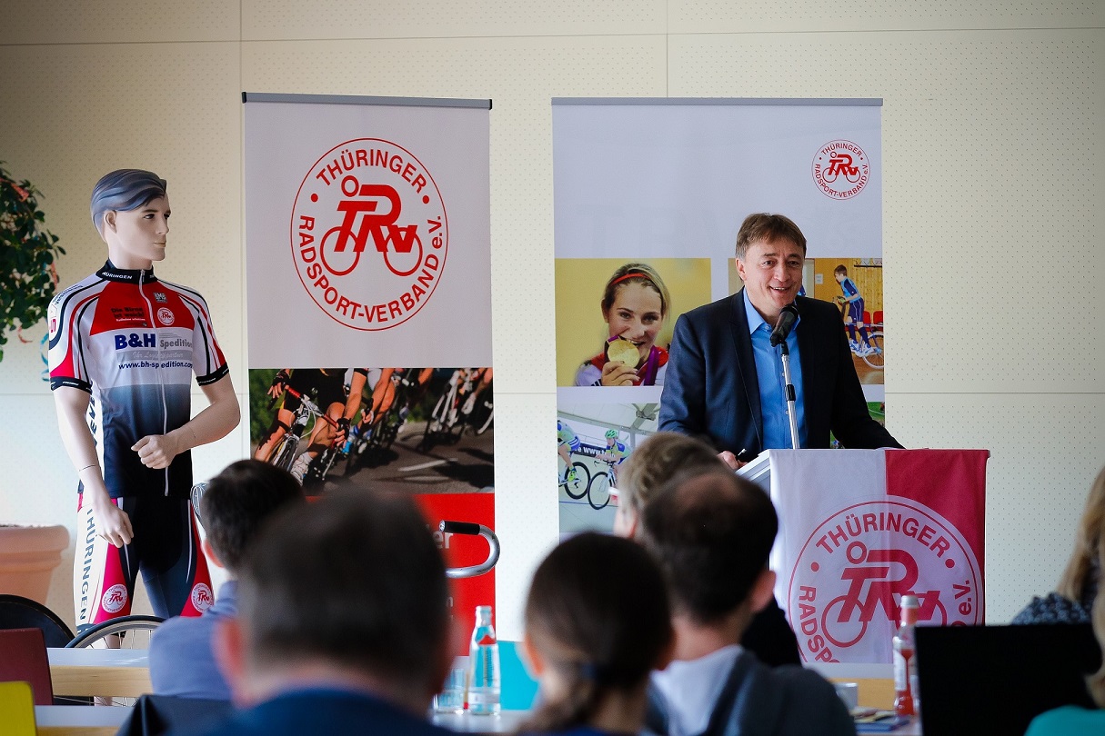 Bad Blankenburg. „Was wir geleistet, was wir in Bewegung gehalten haben und das mit einem perspektivischen Blick in die Zukunft“, gab Uwe Jahn, Präsident des Thüringer Radsport-Verbandes, die inhaltliche Richtung für den 13. TRV-Verbandstag vor, der am vergangenen Samstag in der Landessportschule Bad Blankenburg stattfand. Prof. Dr. Stefan Hügel, Vizepräsident Breitensport beim Landessportbund Thüringen, verwies in seinem Grusswort darauf, dass der Radsport weiterhin die erfolgreichste und leistungsstärkste Sommersportart in Thüringen ist und es fehle nicht mehr viel, sogar zur erfolgreichsten Sportart im gesamten Thüringer Sport zu werden. Ganz soweit wollte Uwe Jahn dann aber nicht gehen. Er sieht in dieser Aussage eher eine Herausforderung, mit dem Ziel, den Abstand zur führenden Sportart, dem Wintersport, weiter zu verkürzen.