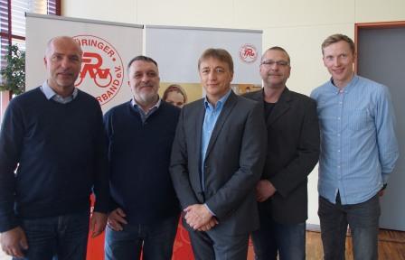 Das neugewählte TRV-Präsidium (v.l.): Marian Koppe (Vizepräsident Marketing/Kommunikation/FSV Thüringia), Rainer Gerth (Vizepräsident Finanzen/RSV Sonneberg), Uwe Jahn (Präsident/1. RSV 1886 Greiz), Knut Wesser (Vizepräsident Hallenradsport/Blau-Gelb Ehrenberg), Lucas Schädlich (Vorsitzender der Thüringer Radsportjugend/SSV Gera 1990).