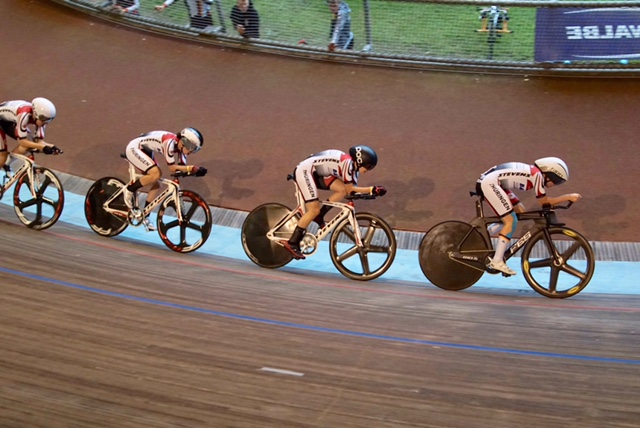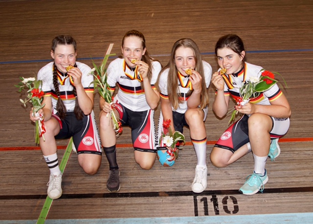 Am zweiten Tag waren zunächst die Sieger*innen in der Mannschaftsverfolgung zu küren. Die Mannschaft der Thüringer Juniorinnen, bestehend aus Franzi Arendt (RSC Turbine Erfurt e.V.), Tasia Ballhaus (SV Sömmerda e.V.), Miriam Zeise (1. RC Jena e.V.) und Lara Röhricht (SSV Gera 1990 e.V.) fuhr mit einer Zeit von 4:14,360 Min. – ca. eine Sekunde schneller als die Zweitplatzierten – zu den Goldmedaillen und in die Meistertrikots.